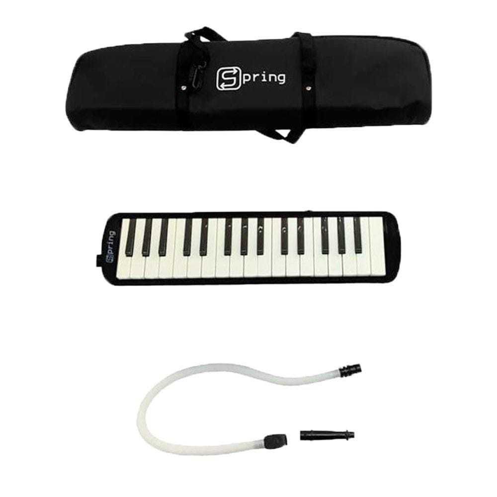 Teclado de Sopro Escaleta da marca Spring com, 32 teclas, na cor preto com braco, bocal curto e bocal longo com cano de extensão flexível. Acompanha bag para transporte e flanela.